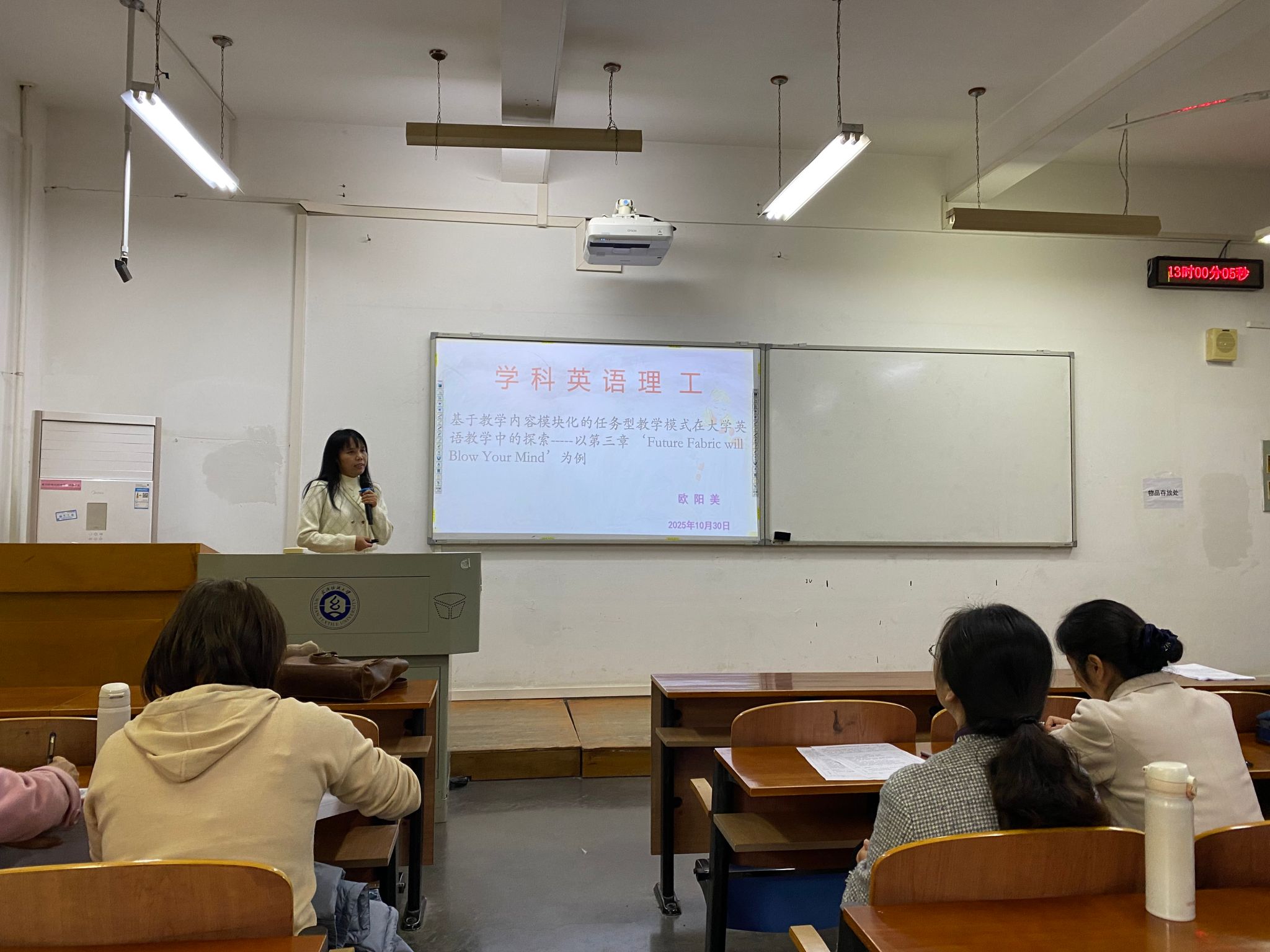 欧阳美老师以《学科英语(理工)》第三单元 “Future Fabric will Blow Your Mind”(未来面料将颠覆认知)为核心案例,系统阐述了 “基于教学内容模块化的任务型教学模式” 的设计逻辑与实践路径。她指出,该模式以 “教学内容模块化” 为前提,以员工为主体,以具体任务为学习动力,将任务完成过程转化为学习过程,最终通过任务成果展示检验教学成效,有效衔接理工学科知识与英语语言能力培养。欧阳美老师强调,理工学科英语教学需打破 “语言学习与学科知识割裂” 的传统模式,通过模块化任务设计,实现员工英语语言技能与理工学科素养的双重提升。