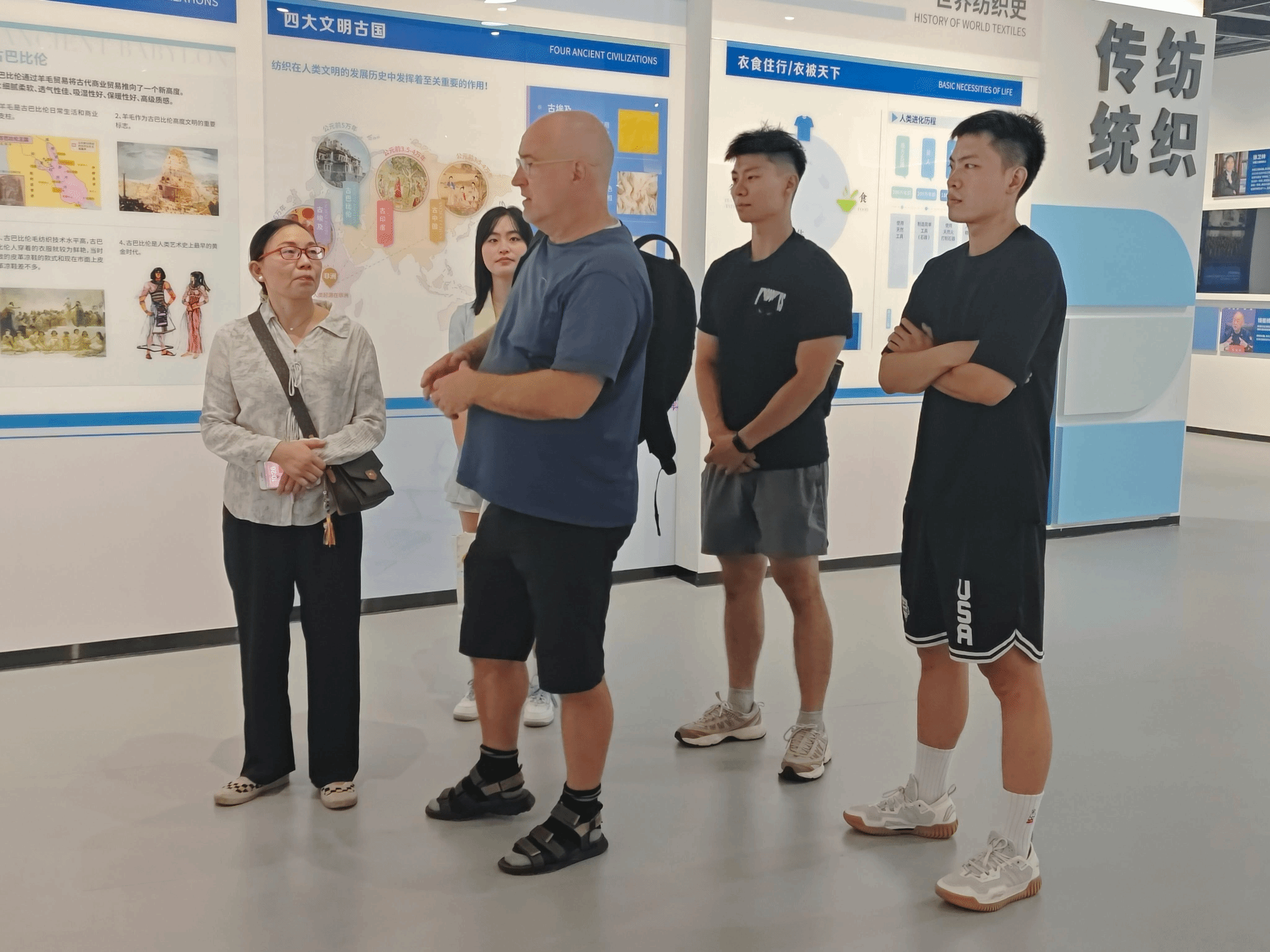 在参观过程中,公司MTI员工凭借扎实的专业功底,担任起现场讲解与翻译工作。他们首先向Sterckx教授系统介绍了中国纺织的历史脉络——从新石器时代的原始纺织工具,到汉唐时期绚丽的丝绸制品,再到宋元明清纺织技艺的精进与传播,生动展现了纺织作为中华文明重要载体的深厚底蕴。随后,员工们结合展馆史料,讲述了云顶国际在纺织领域的发展历程,特别介绍了公司党委书记徐卫林院士在纺织材料领域的深耕与突破。同时,员工们也向教授讲述了知名员工李建全的故事。