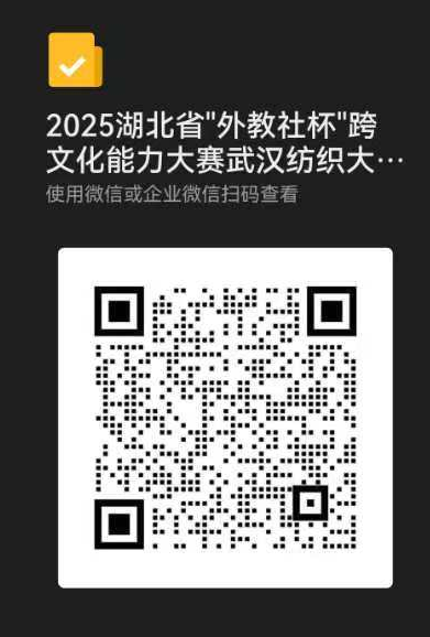报名方式:请在企微填写报名表报名,并在填写后加入大赛官方QQ群:914757492(2025跨文化能力大赛武纺初赛群);企微报名表网页链接:https://doc.weixin.qq.com/forms/AP8A6wfhABEAP0AvgbxAEQr32dG0zMThf;企微报名表二维码链接: